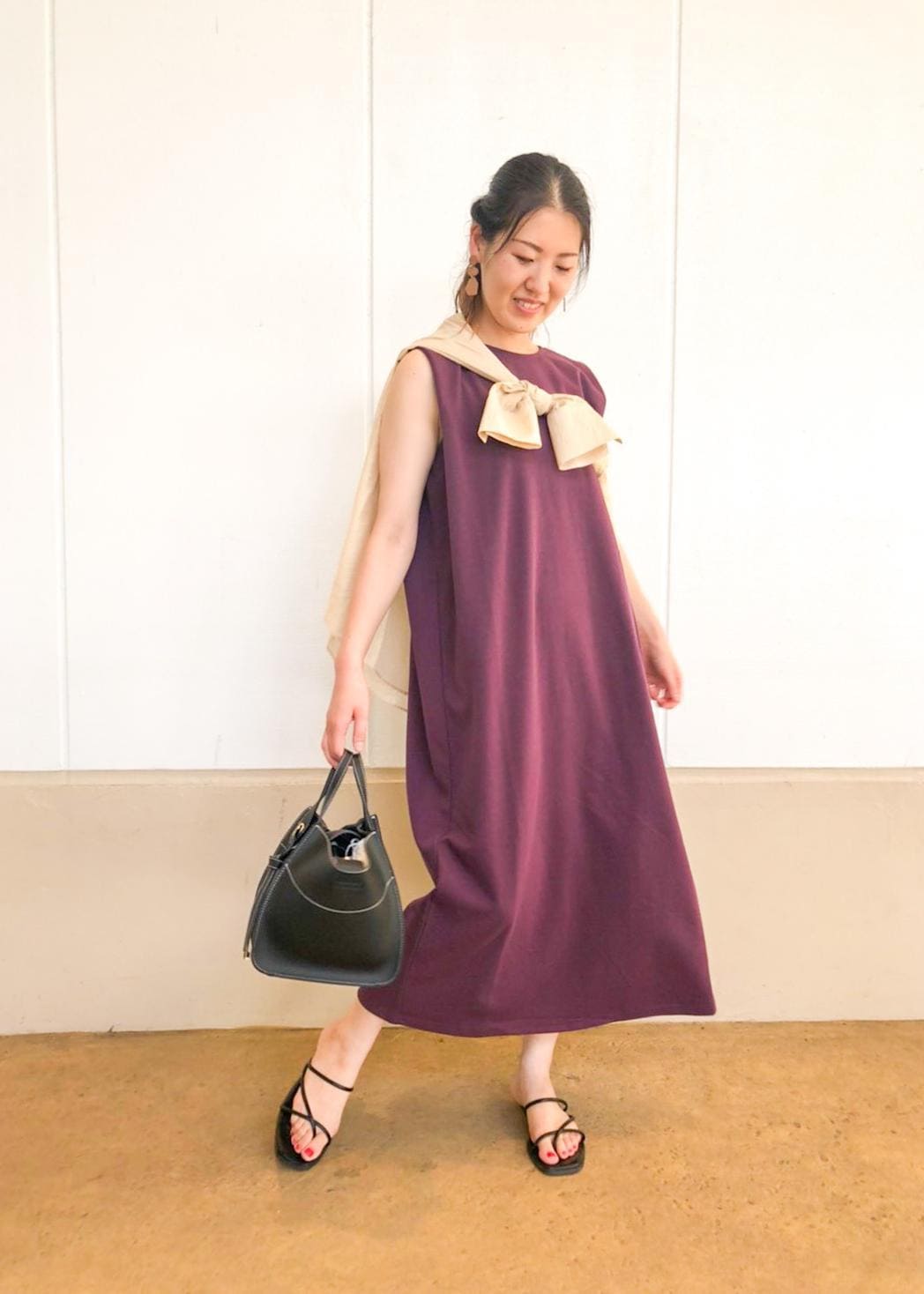 まだまだ暑い日が続きますが、ノースリーブワンピースはカラーに深みを持たせて色で秋を先取りしました!寒暖差や室内冷房対策にはシャツやカーディガンがおすすめです!バックはやサンダルは黒でより全体を引き締めてみました!