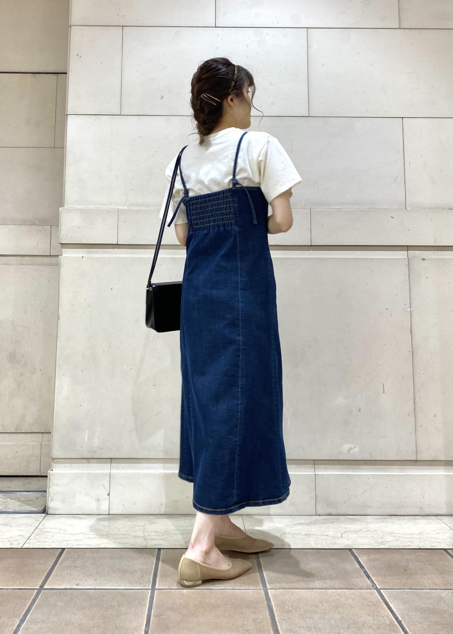 Tシャツ×デニムワンピースを使ったカジュアルフェミニンスタイルです♡