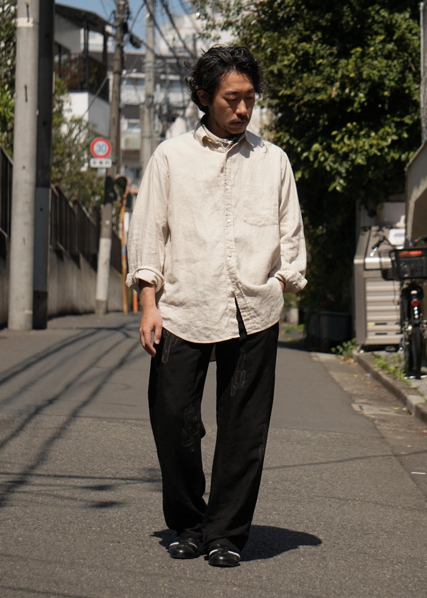 ドレスシャツ生地を使用したカジュアルシャツ。