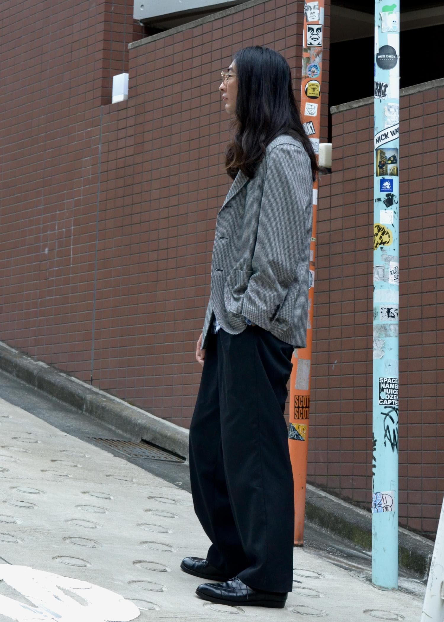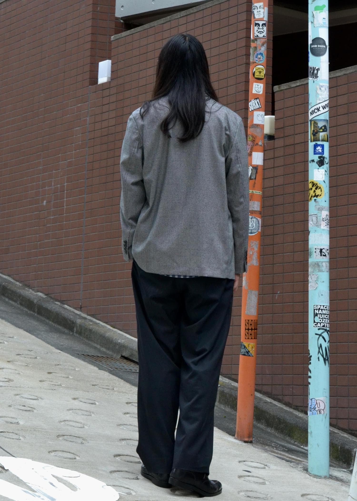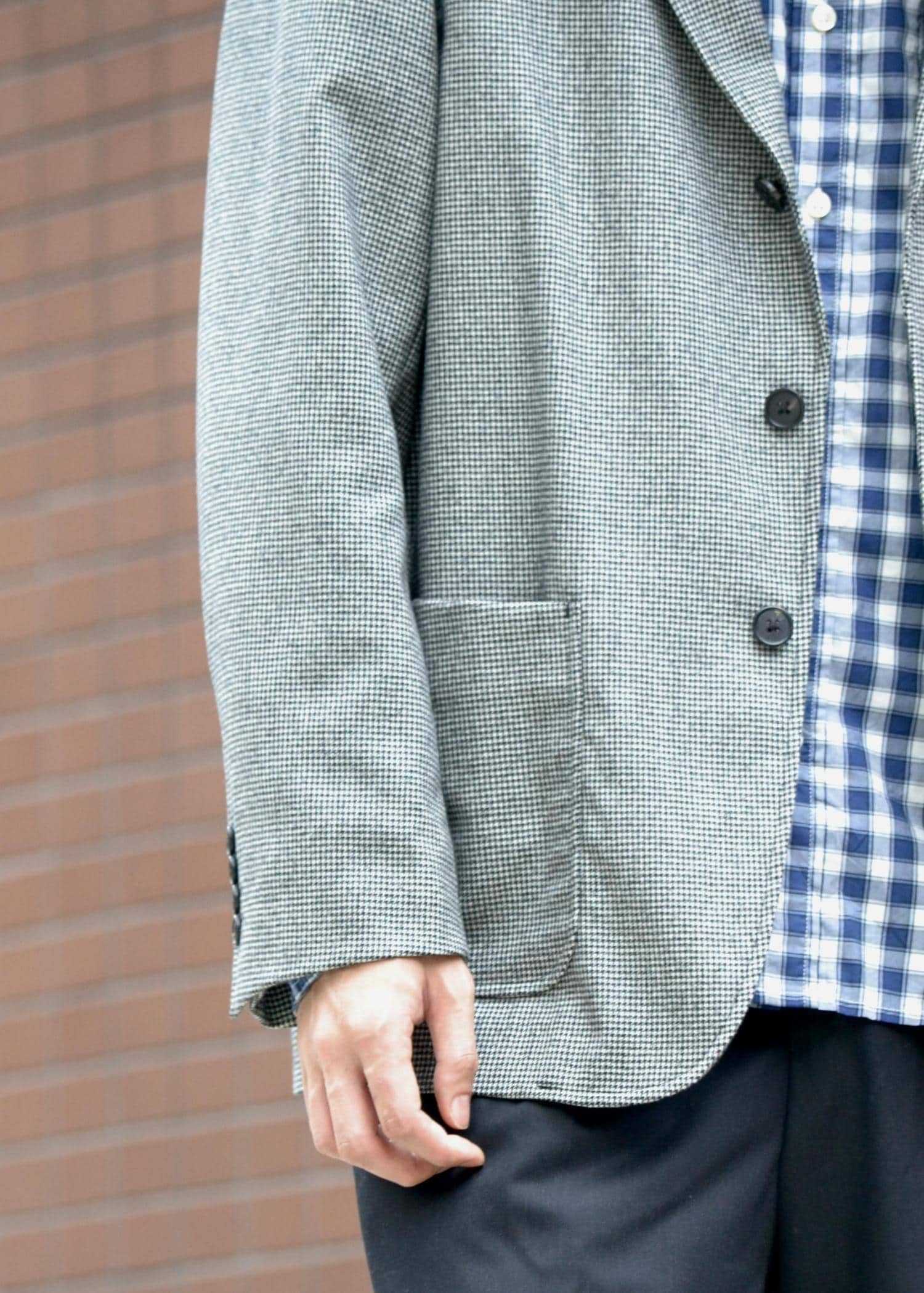 ワークジャケットがベースで絞りが無く、ボックス型のシルエットをしているため、セットアップは勿論のこと単品使いもしやすい一着です。