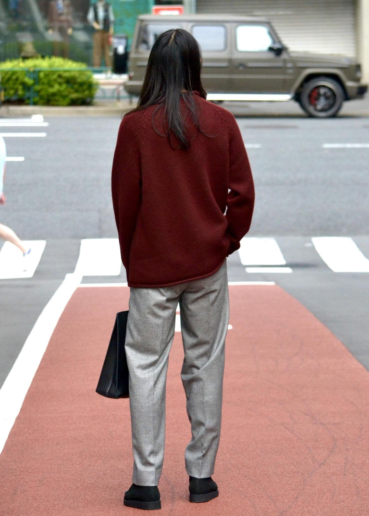 a.presseのニットはロールネックになっており、アクセントは効いていますが、全体的に遊びすぎてないスタイリング。
