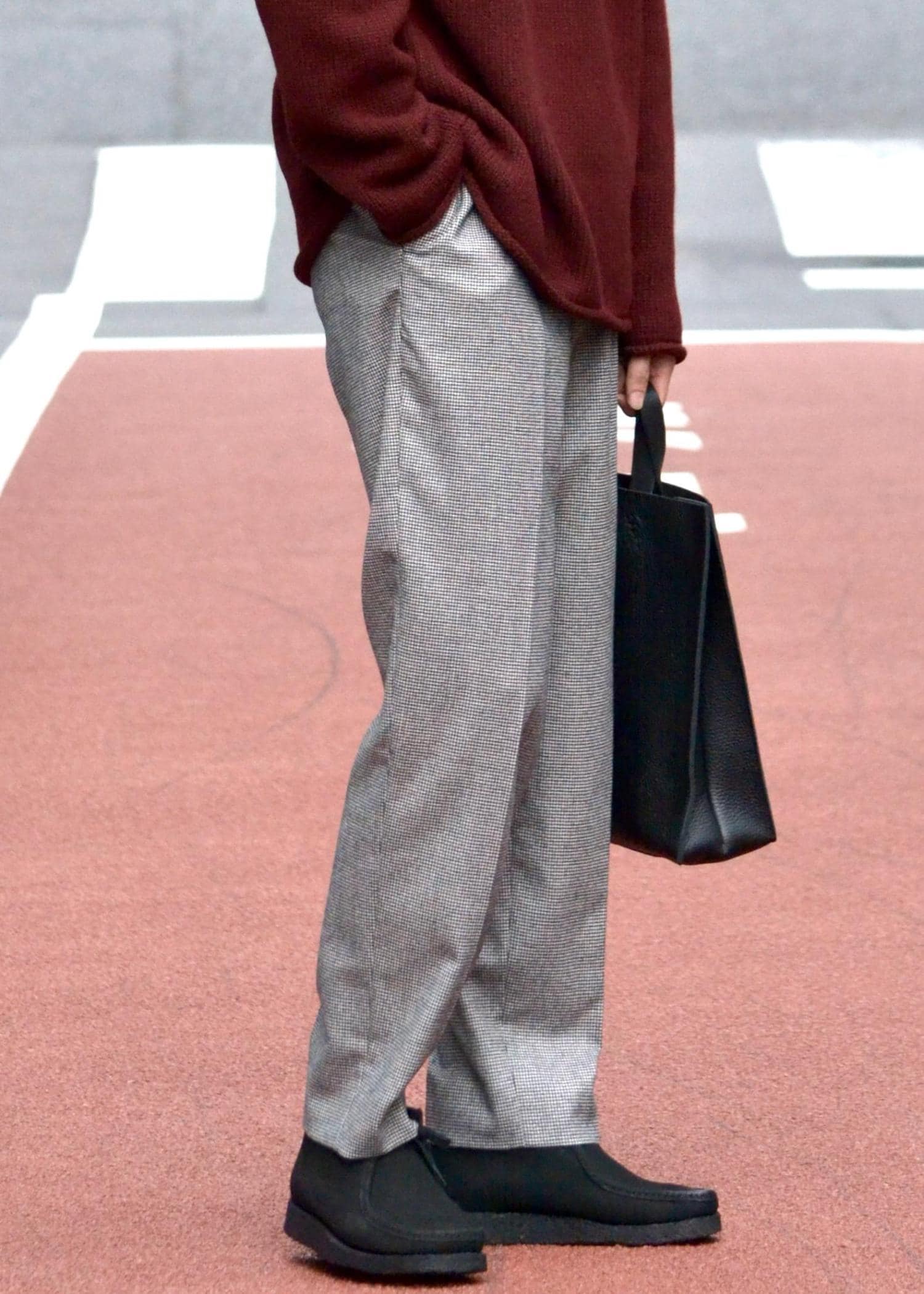 スラックスはテーパード仕様の綺麗なシルエットで、トラッドな千鳥柄になっており、柄が細かいため主張しすぎないのが英国紳士ぽくていい所です。