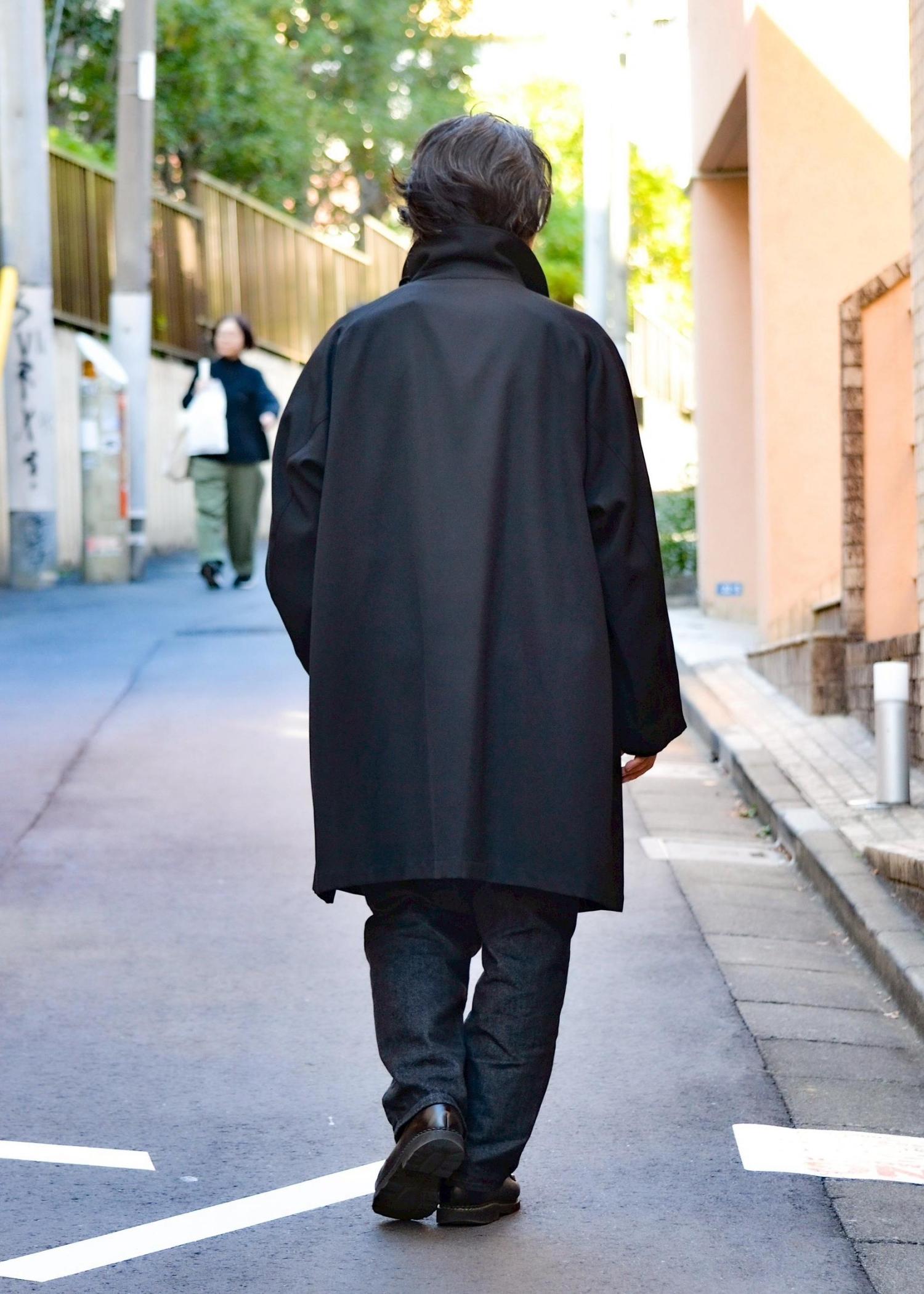 リラックスしたシルエットにウールギャバジンのハリのある生地を用いており、ゆとりに対してスッキリとした印象に仕上がっています。