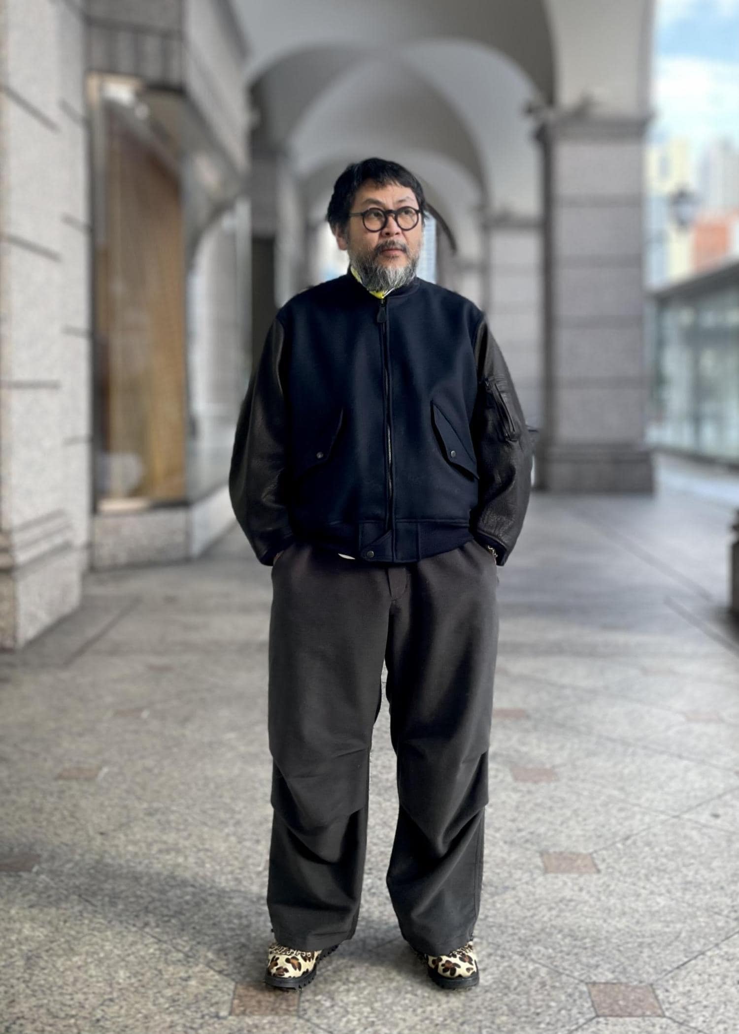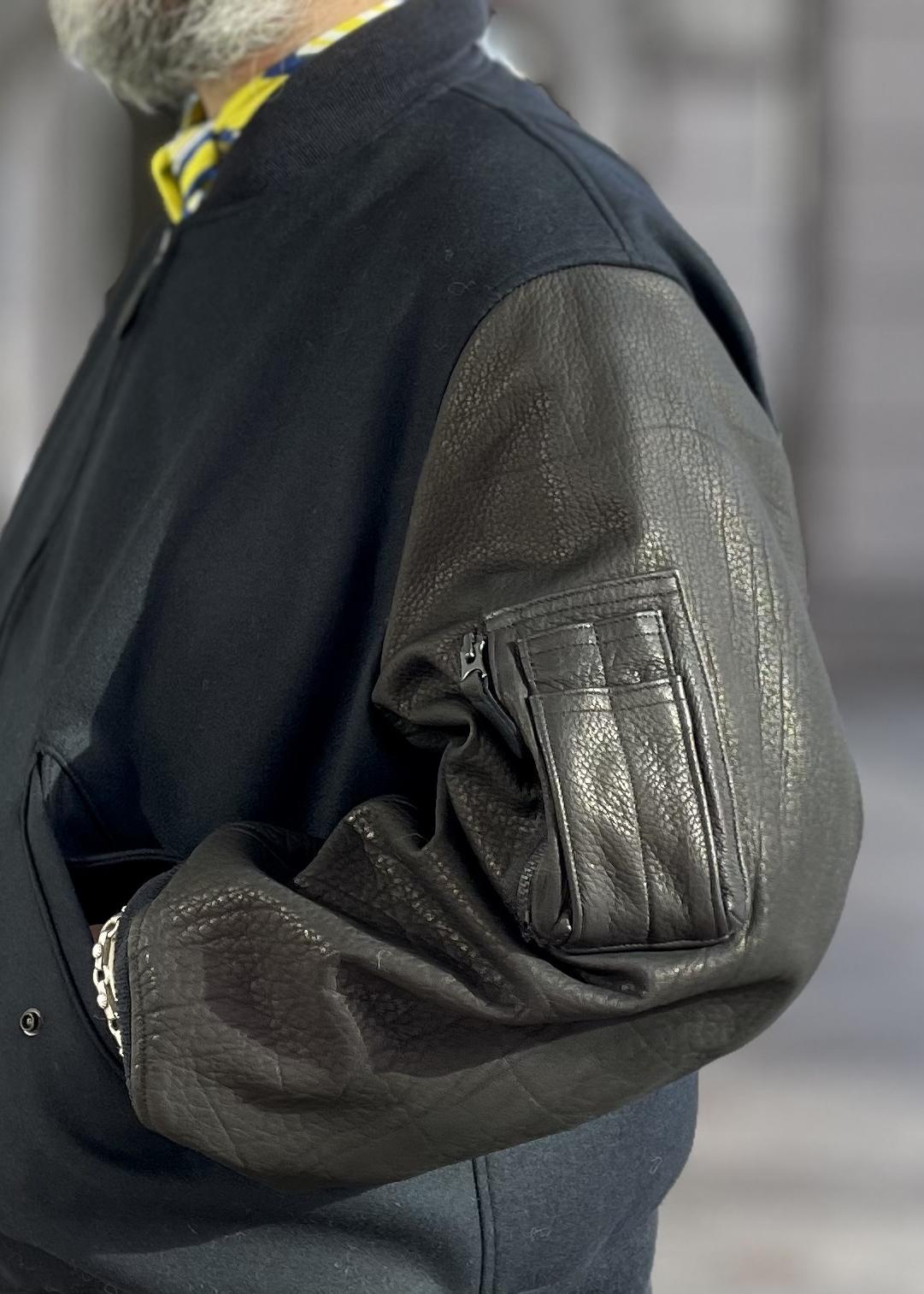 身頃はウールメルトン、袖はディアレザーのボンバージャケット。Super140’s の高密度メルトンは、しなやかさとハリのバランスがよく、深みのある色味もポイント。ディアスキンの柔らかさと力強さが、ウールとの良いコントラストになっています。