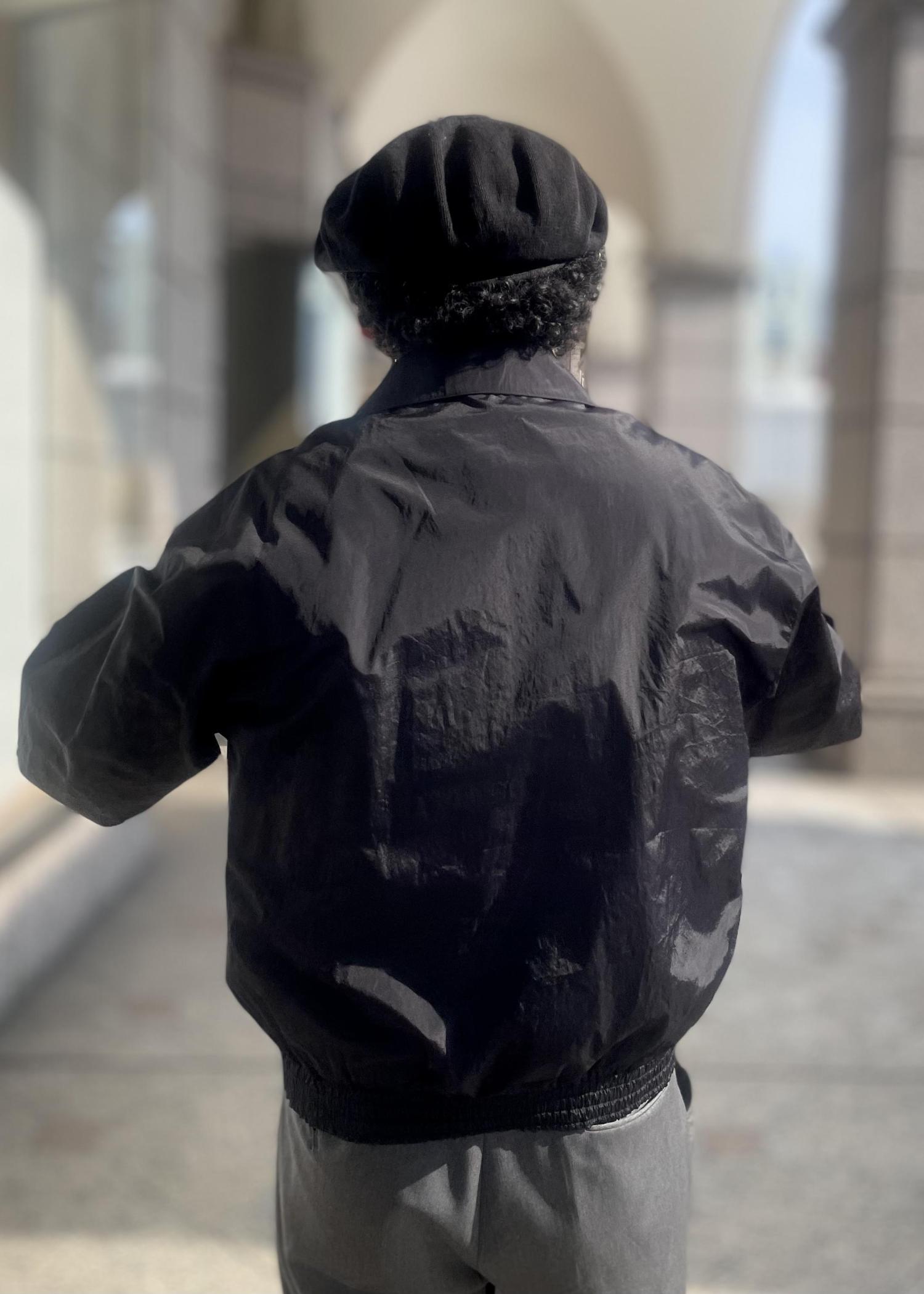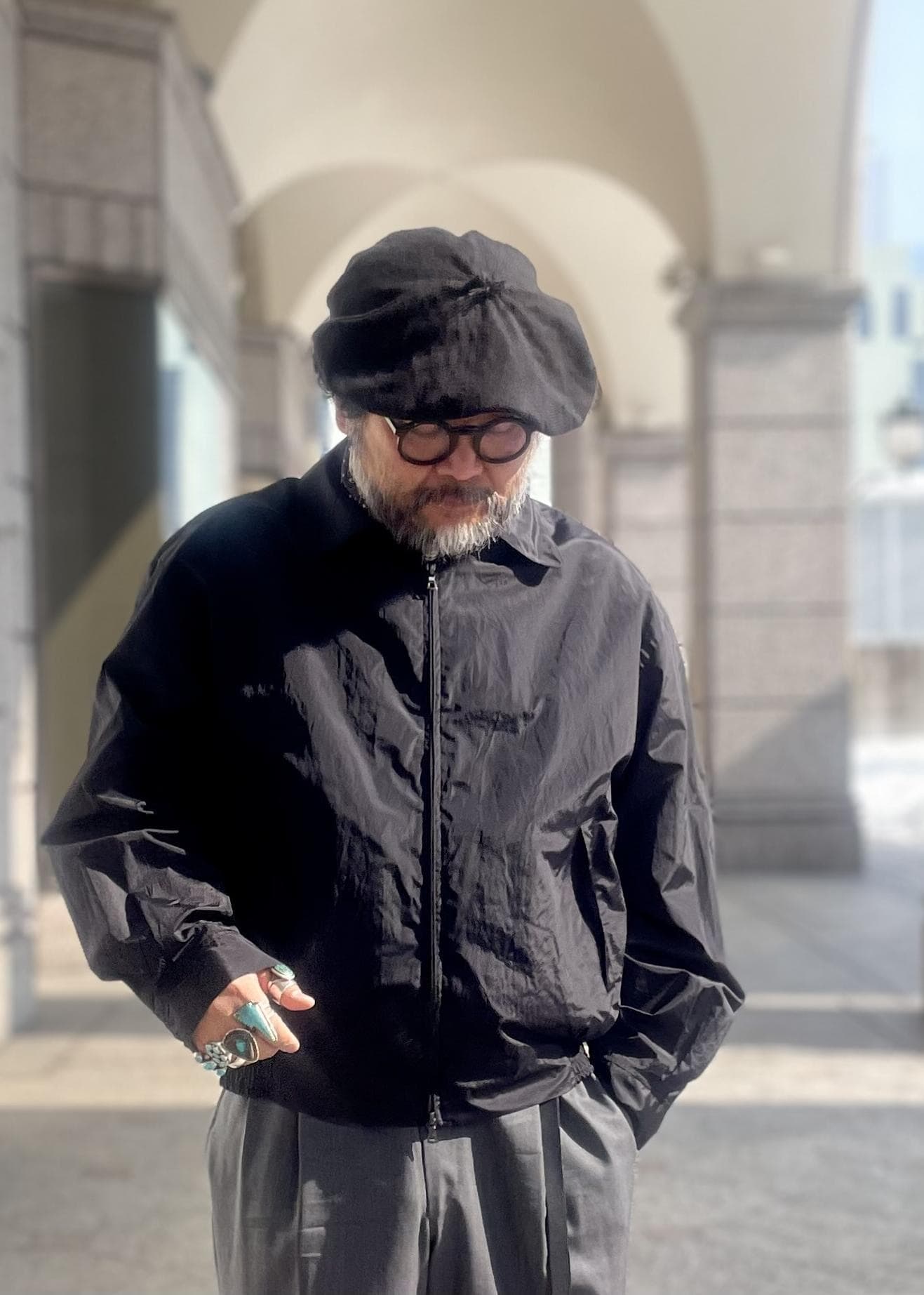 ポリエステルとシルクをブレンドした、軽やかな着心地のジップジャケット。細番手のシルク糸と生糸を交互に織ることで、ほどよいハリがありながらやわらかさを感じる風合いに仕上げています。しなやかな落ち感と鈍い光沢が、ブラックにさりげない奥行きを与えてくれます。