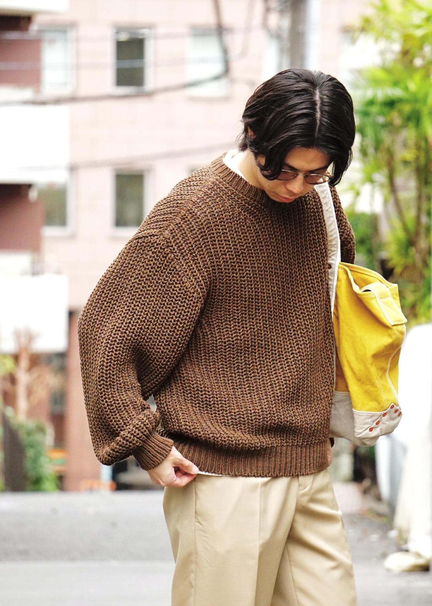 別注のバトナーは、大番手の平糸を糸でミックスしローゲージの編み機で編んだ春夏のチャンキーニットで、清涼感を感じるザックリとした編み地がこれからの季節に重宝するアイテムです。