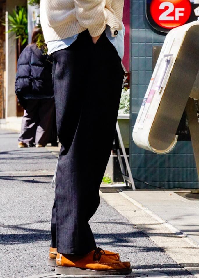 高密度に織られたリネン素材がハリとコシを出し、たくさん履いてもへたらなさそうで使い勝手が良いです。