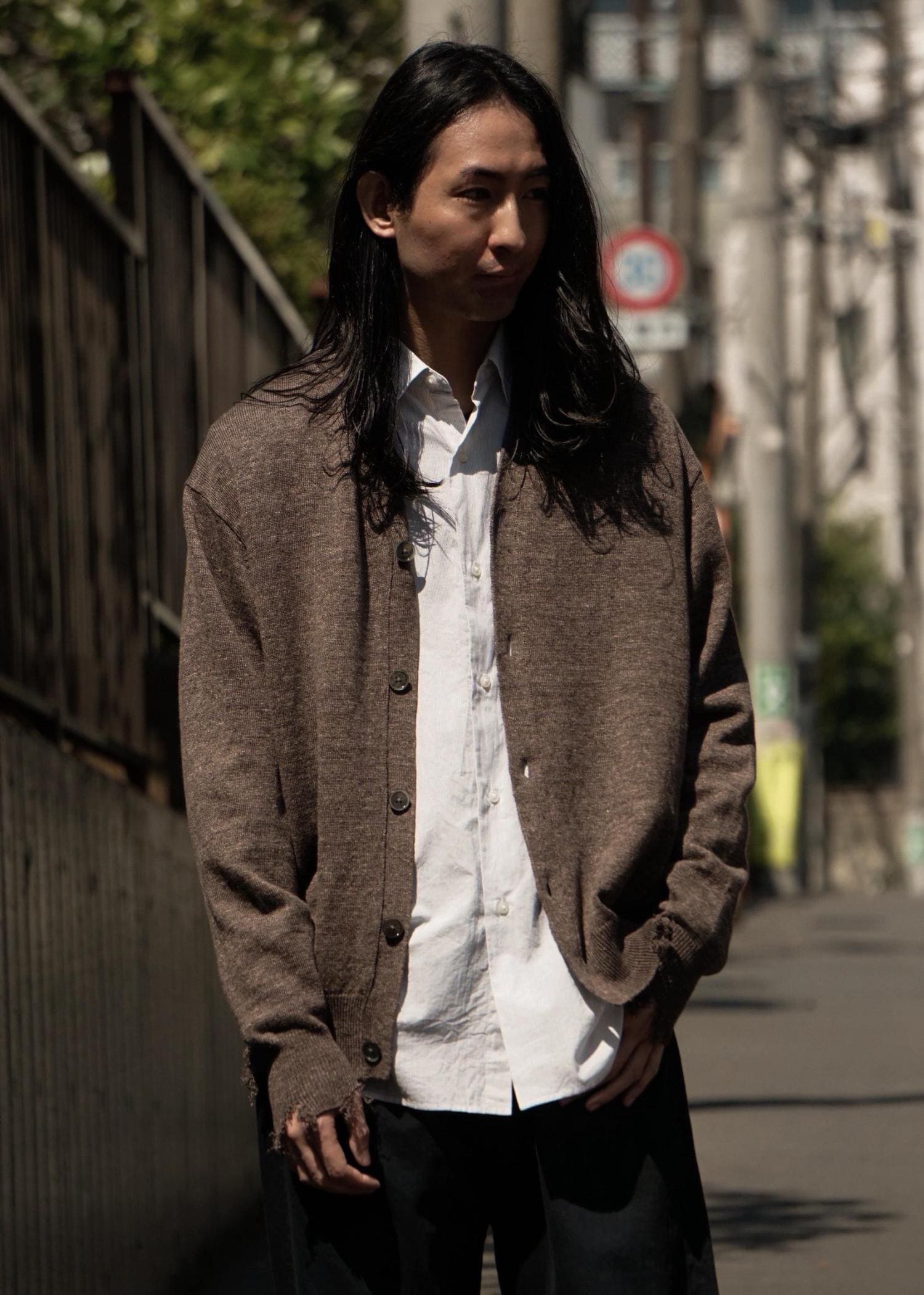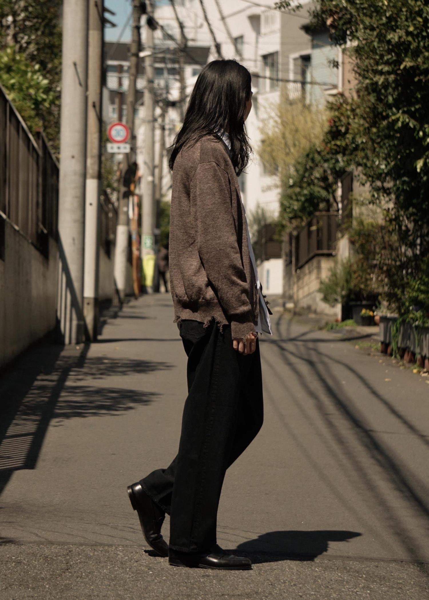 a.presseのブラックデニムにロエフのダメージカーディガンを合わせて、グランジライクなスタイリング。