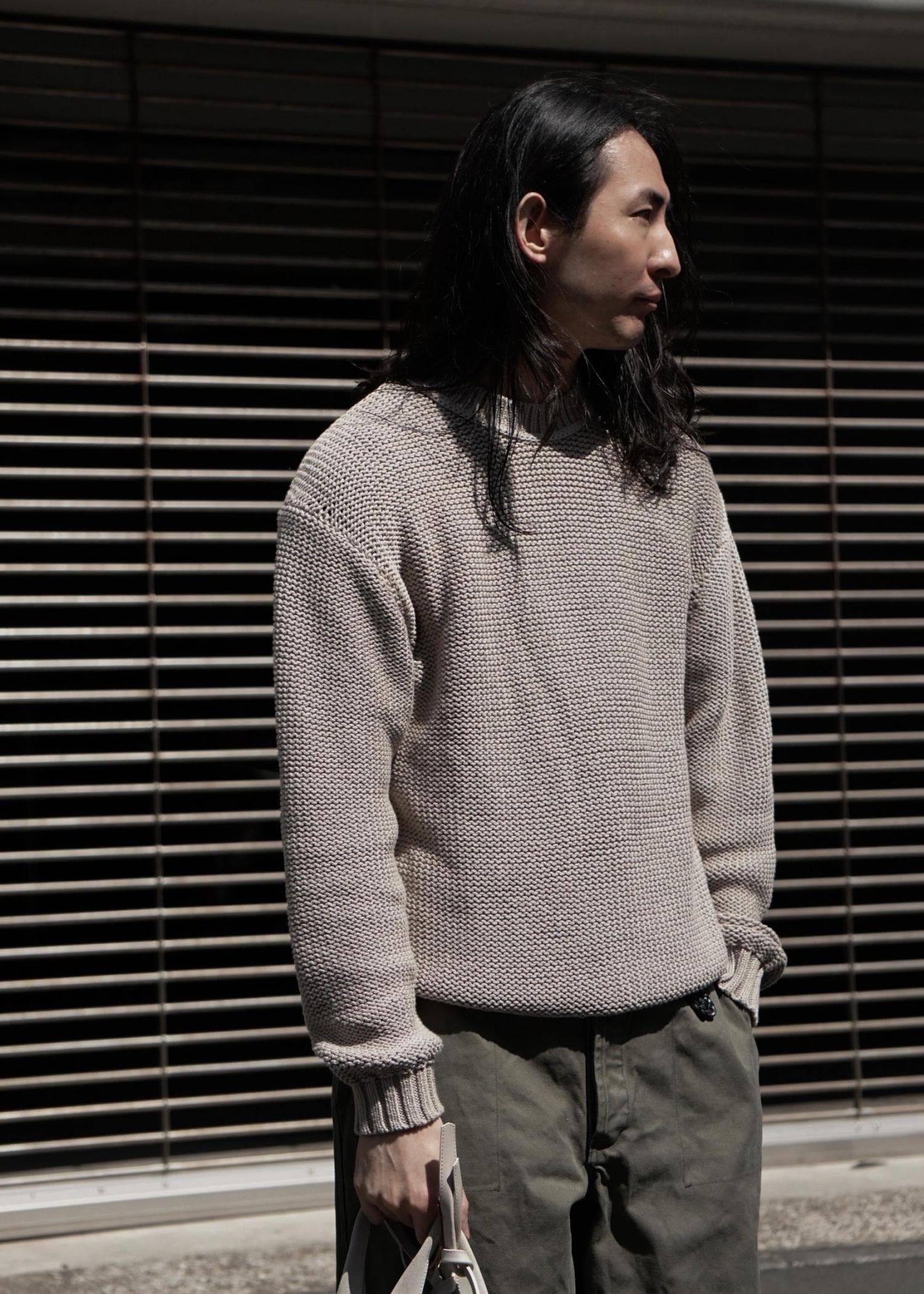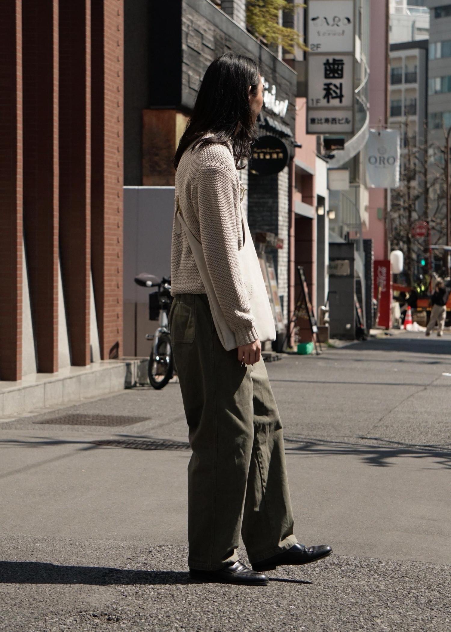 wild life tailorのざっくりとした編み地のニットはデザインもさることながら、軽さと通気性があり、夏前ぐらいにはショーツなどに合わせたくなります。