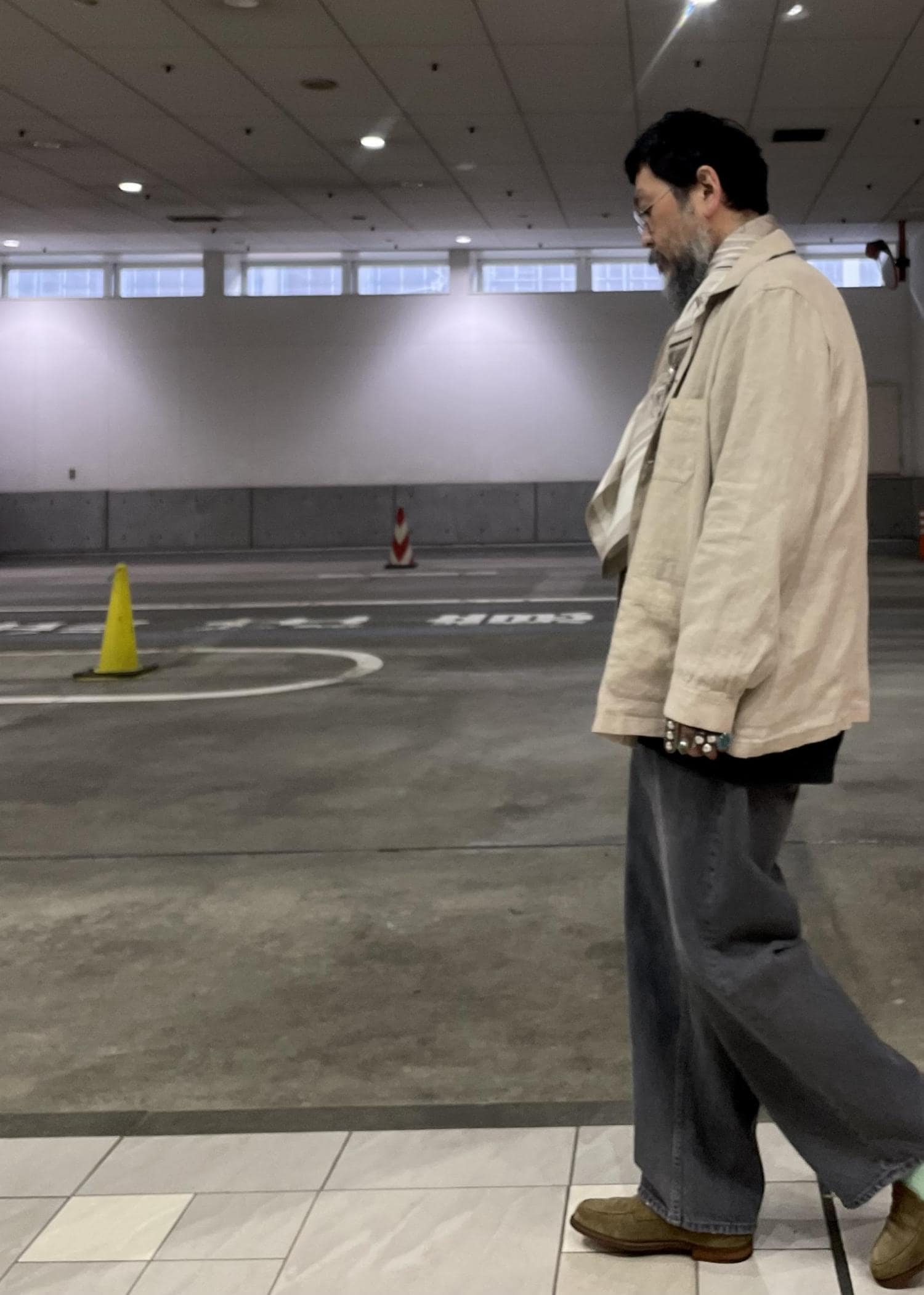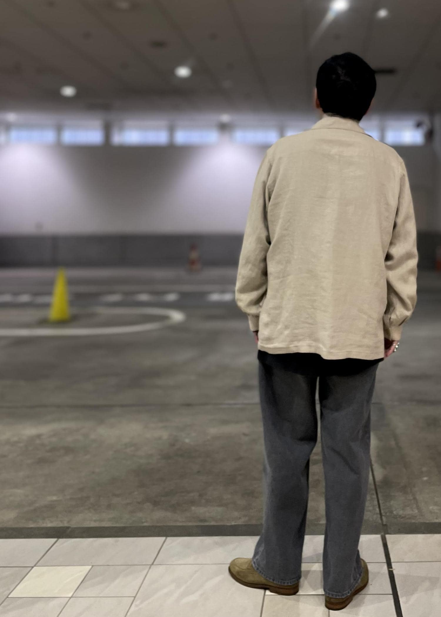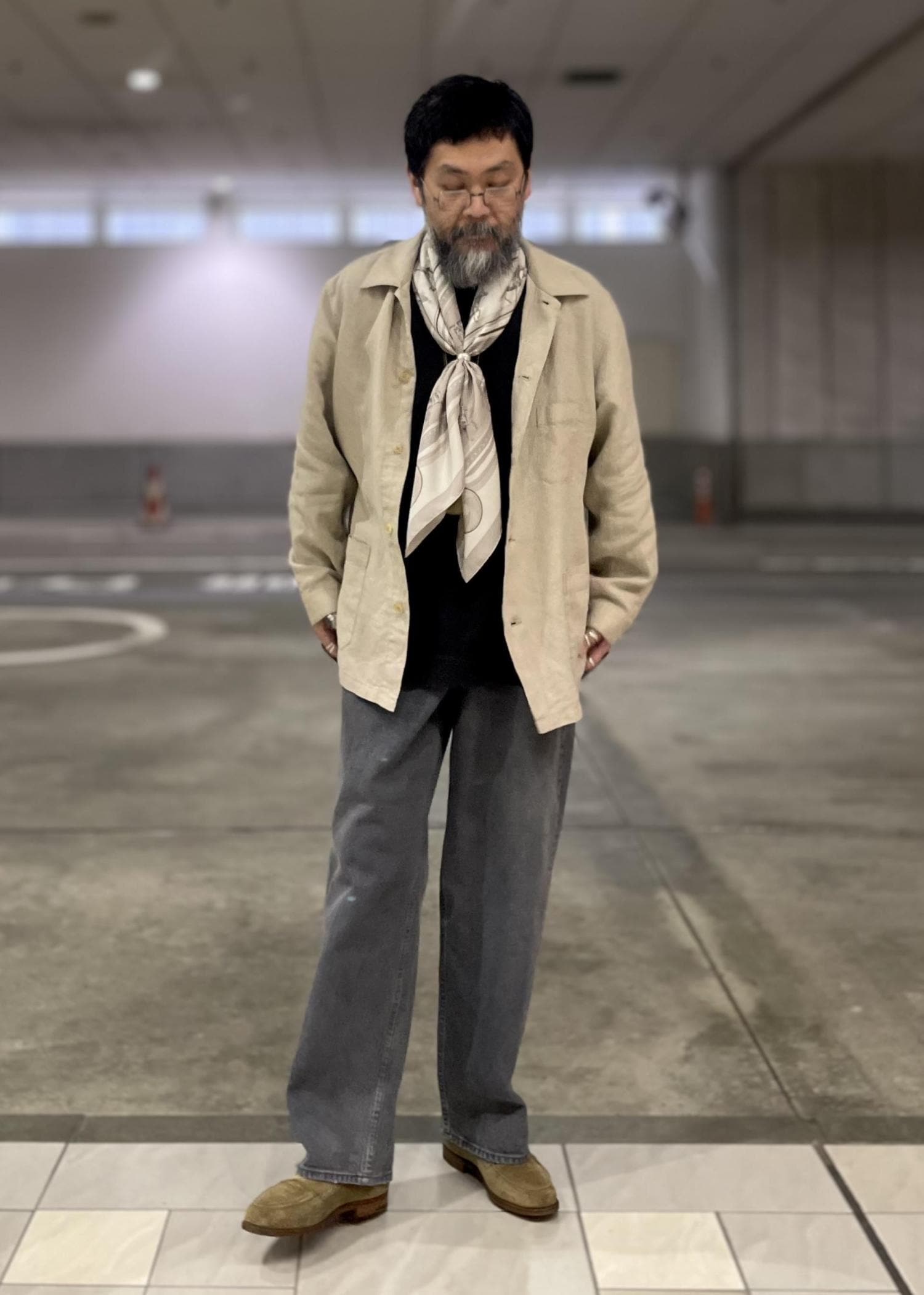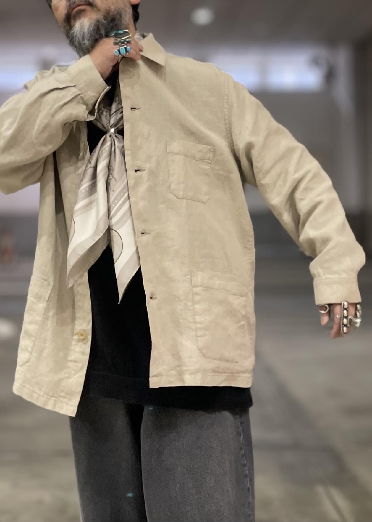 ヨーロッパのニュアンスの強いカバーオールにルーズフィットテーパードシルエットのグレーデニムを合わせ、エルメスのスカーフを首にかける事で大人のカジュアルを表現しました。